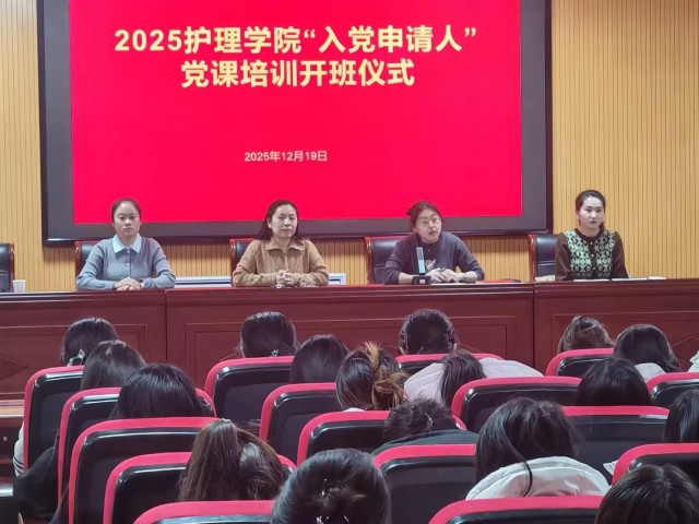 为深入学习贯彻习近平新时代中国特色社会主义思想、党的二十大精神及党的二十届四中全会精神,切实加强党员发展源头建设,帮助入党申请人端正入党动机、筑牢信仰根基,护理学院党委于12月19号举行“2025年入党申请人”党课培训开班仪式。